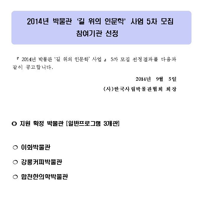 2014 박물관 길 위의 인문학 5차 기관모집 선정결과발표 페이지 정보 작성자 관리자 작성일14-09-05 14:34 조회37,862회 댓글0건 관련링크 이전글 다음글 목록 본문 댓글목록 등록된 댓글이 없습니다. 이전글 다음글 목록